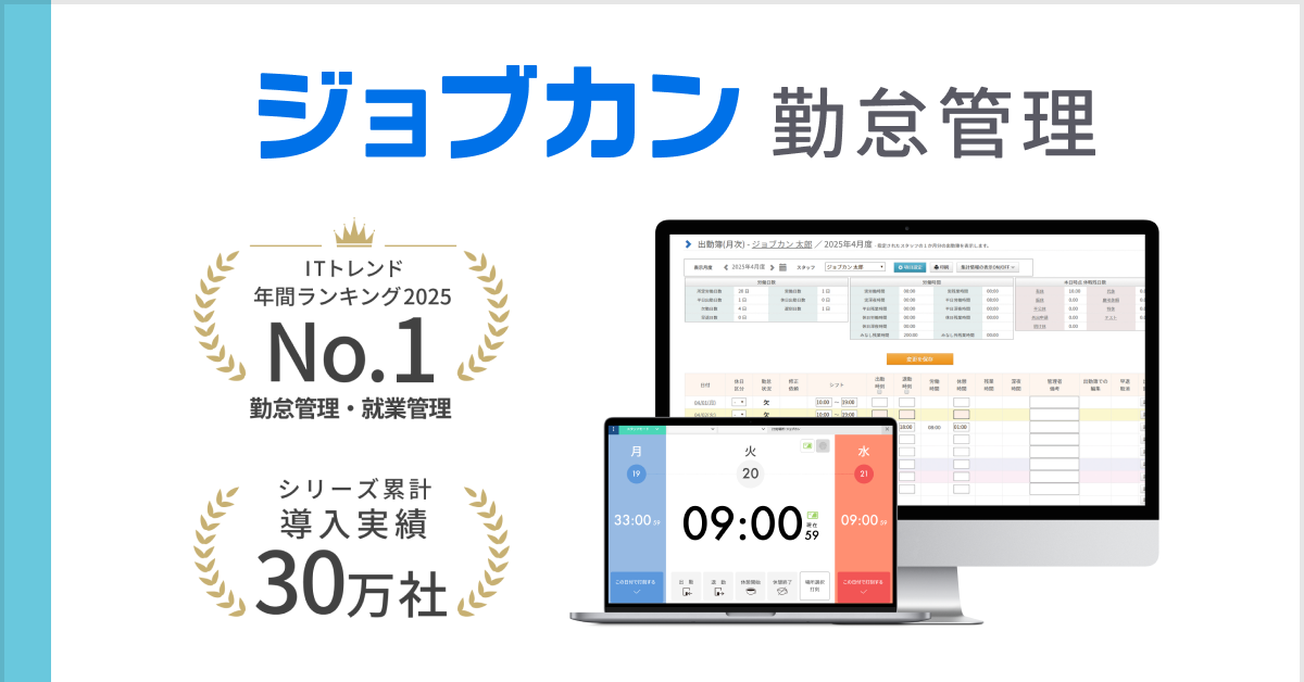 ※ 法人向けIT製品の比較・資料請求サイト「ITトレンド」が発表した「ITトレンド年間ランキング2025」において、「勤怠管理・就業管理システム」部門、「シフト管理・人員計画(WFM)システム」部門、「ワークフローシステム」部門、「経費精算システム」部門、「クラウド型経費精算システム」部門、「採用管理・選考管理システム」部門、「労務管理システム」部門、「給与計算システム」部門、「Web請求書・クラウド請求書」部門、「帳票電子化ツール」部門、「DX支援・コンサルティング・アウトソーシング」部門で第1位を獲得。